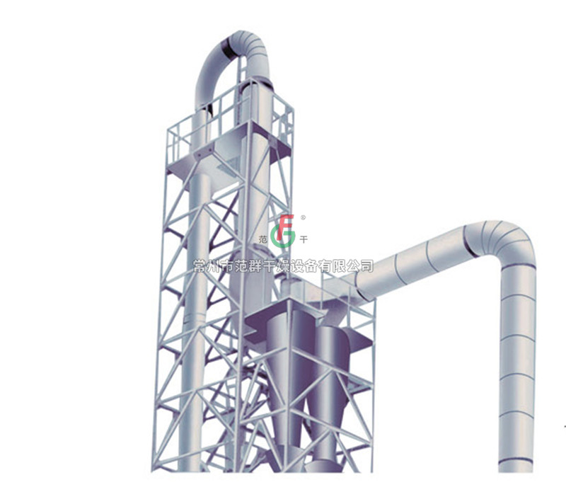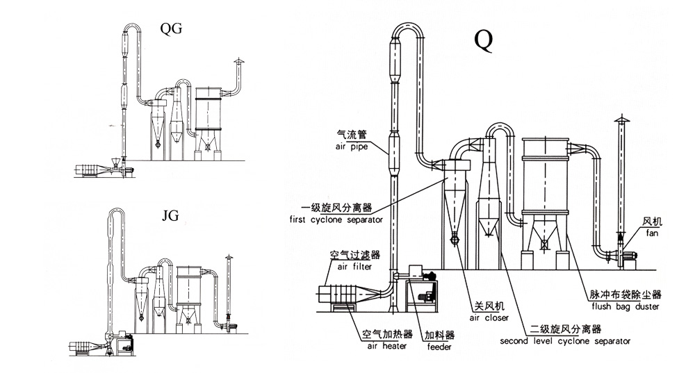 濕物料經(jīng)輸送機(jī)與加熱后的自然空氣同時(shí)進(jìn)入干燥器,二者充分混和,由于熱質(zhì)交換面積大,從而在很短的時(shí)間內(nèi)達(dá)到蒸發(fā)干燥的目的。干燥后的成品從旋風(fēng)分離器排出,一小部飛粉由旋風(fēng)除塵器或布袋除塵器得到回收利用。Q型氣流干燥器是負(fù)壓操作,物料不經(jīng)過風(fēng)機(jī);QG型氣流干燥器是正壓操作;物料經(jīng)過風(fēng)機(jī)帶有粉碎作用;FG型氣流干燥器是尾氣循環(huán)型;JG型氣流干燥器是強(qiáng)化型氣流干燥器,其集閃蒸干燥與氣流干燥為一體,是我公司根據(jù)用戶要求設(shè)計(jì)的新型干燥設(shè)備。
