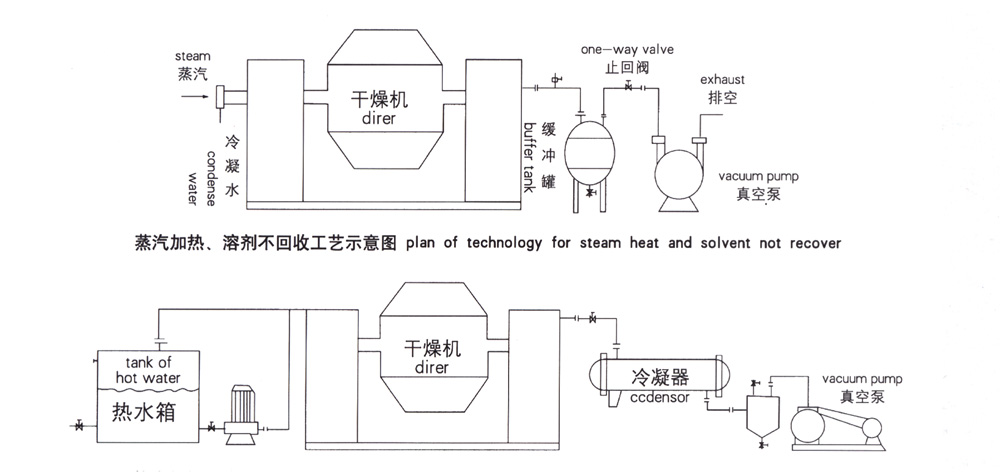 SZG雙錐回轉(zhuǎn)真空干燥機(jī)為雙錐形的回轉(zhuǎn)罐體,罐內(nèi)在真空狀態(tài)下,向夾套內(nèi)通入蒸汽和熱水進(jìn)行加熱,熱量通過罐體內(nèi)壁與濕物料接觸。濕物料吸熱后蒸發(fā)的水汽,通過真空泵經(jīng)真空排氣管被抽走。由于罐體內(nèi)處于真空狀態(tài),且罐體的回轉(zhuǎn)使物料不斷的上下,內(nèi)外翻動,故加快了物料的干燥速度,提高干燥效率,達(dá)到均勻干燥的目的。