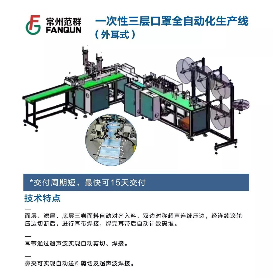 考慮到目前巨大的口罩需求矛盾,常州范群利用其自身的設(shè)備制造企業(yè)優(yōu)勢(shì),在這個(gè)特殊時(shí)期,向客戶特別推出全自動(dòng)一次性三層口罩生產(chǎn)線(外耳式一拖一)和全自動(dòng)一次性三層口罩生產(chǎn)線(外耳式一拖二)兩款設(shè)備。以下為設(shè)備具體參數(shù)信息。