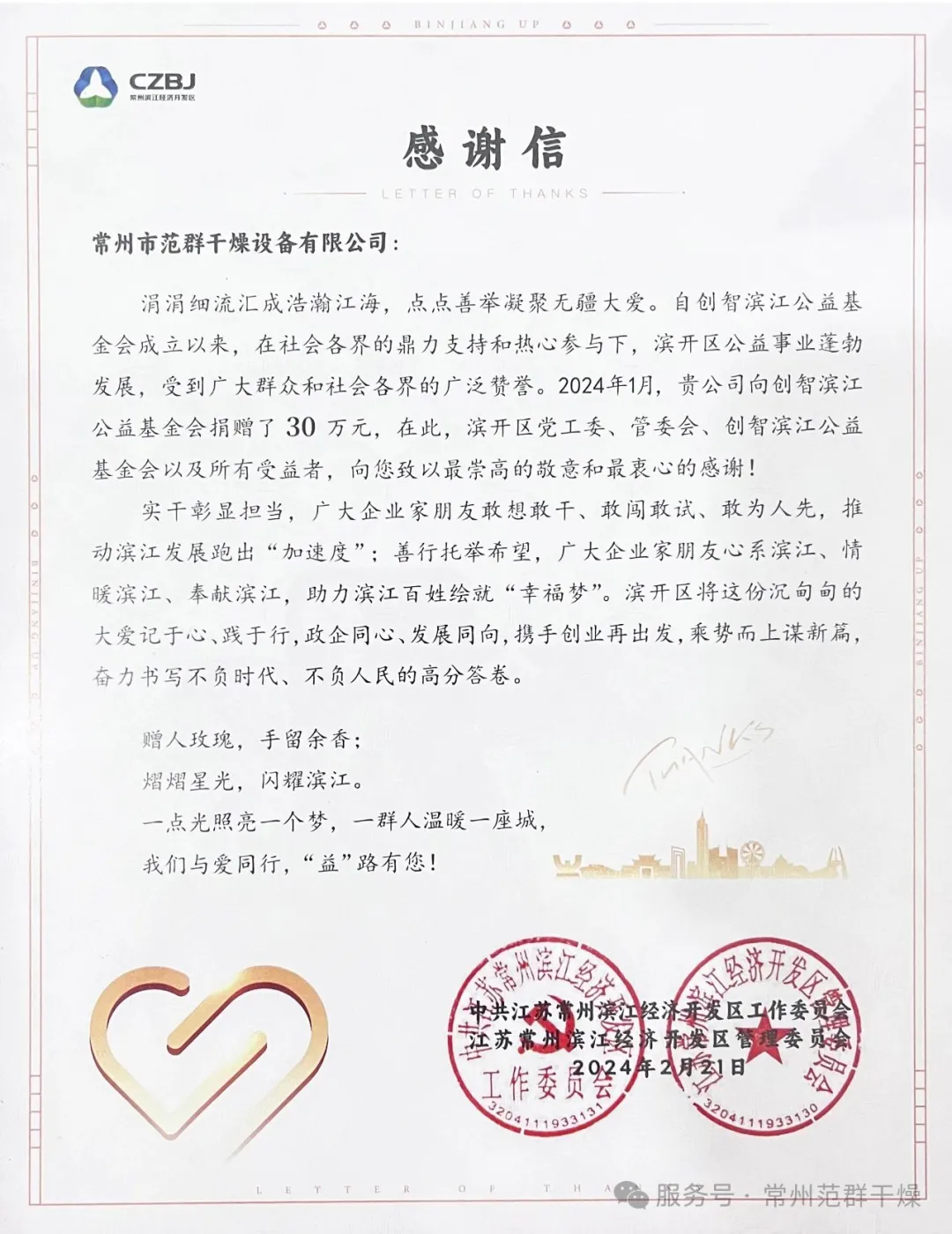 近日,常州市范群干燥設(shè)備有限公司向創(chuàng)智濱江公益基金會捐贈30萬元,以實(shí)際行動支持濱開區(qū)公益事業(yè)發(fā)展,用愛心善舉踐行企業(yè)社會責(zé)任,為區(qū)域公益事業(yè)注入溫暖力量。